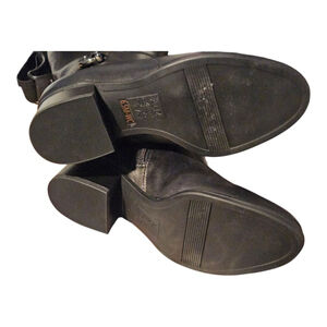 These are a pair of women's Naturalizer black leather heeled boots, size 6.5. The boots feature a knee-high shaft with a full-length zipper on the inner side and a decorative strap with a silver-toned buckle around the ankle. The heels are block-style and appear to be approximately 1.5 to 2 inches high. The soles are rubber with a textured grip. Visible signs of wear, some creasing in the leather.