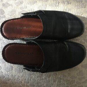 Naturalizer Black leather slip-on clog with accent side buckle. Has a low wedge of water proof rubber sole. (worn twice) purchased at Macys for $49.99 on sale. Size 7 Slight wear on the bottom heals.