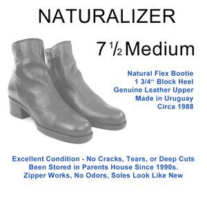These brown leather Naturalizer Ankles Boots are over 35 years old and in exceptional condition. In clearing my parents house these boots were worn a few times and then stored for the past 30+ years in a closet. They feature genuine leather uppers, side zippers, and block heels. They are in exceptional condition with no damage, no cracks, no stains, no odor or mildew and the soles look like new, a 9 out of 10 rating. These size 7 ½ M women’s boots are made in Uruguay.