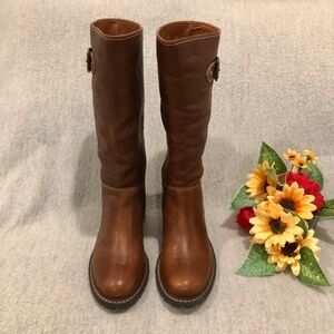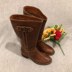 These classic boots are made of genuine brown leather and reflect the grain, texture, and irregularities seen in genuine leather. The boots have 1.5-inch stack-look back heels and .5-inch front soles. The boots also have tan topstitching and burnished-bronze decorative upper buckles. The boots look great with everything from jeans and shorts to casual skirts and dresses.