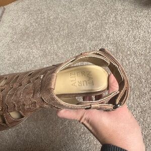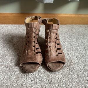 Sophisticated brown sandals with a stylish cutout design. Comfortable block heel for all-day wear.
