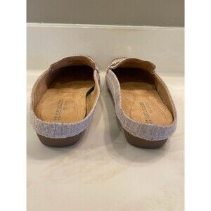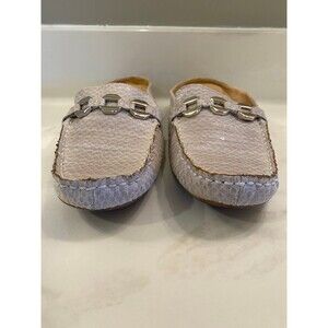 Elegant cream mules with textured design. Features silver accents. Comfortable and stylish.
