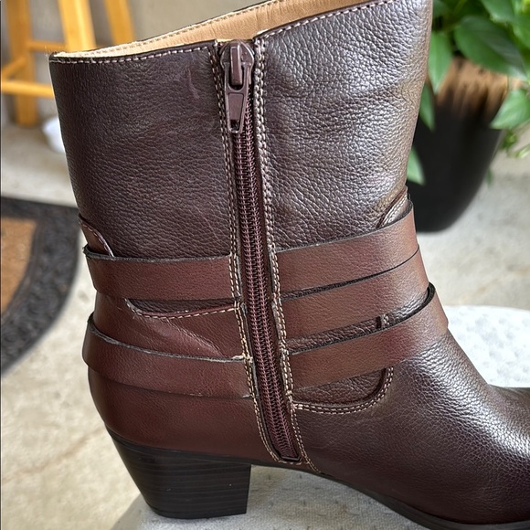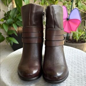Stylish dark brown ankle boots with buckle straps. Perfect for versatile wear.