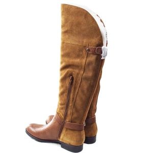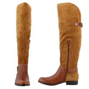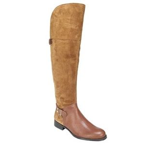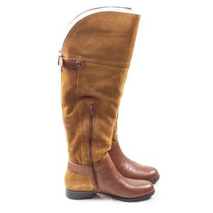 Decorative buckle straps detail a over-the-knee leather boot made with a low heel and slit at the top line for easy movement.