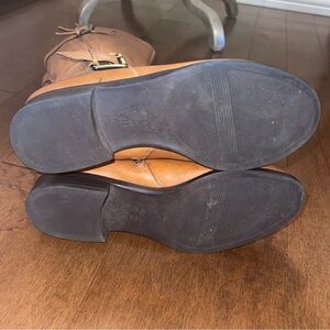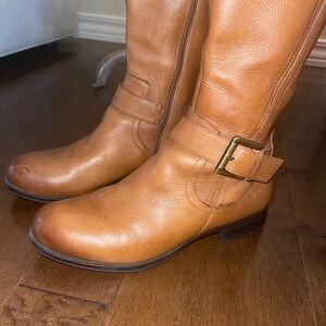 Naturalizer Jessie Tall Leather Buckle Equestrian Riding Boots. Beautifully polished with pebbled leather, wraparound straps and gold-toned buckles, this comfortable, tall shaft boot is always along for the ride. Side zip closure. Color is Banana Bread. A few minor marks on leather but still in excellent condition.