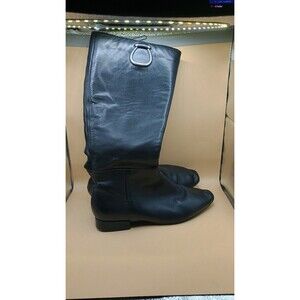 The product is a pre-owned Naturalizer leather black flat boot in size 8 with a wide calf. It features a knee-high shaft, round toe, zipper closure, and a flat heel. This riding boot is designed for women and has a solid black color with zipper accents. Made of leather, it offers a comfortable and stylish option for those looking for a versatile and natural-themed footwear choice.