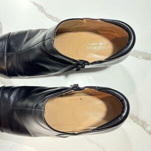 Sleek black leather ankle boots by Naturalizer. Side zipper closure. Comfortable Cushioned Insole and Block Heel.