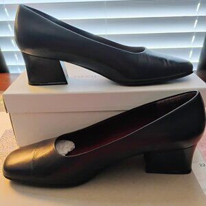 Excellent condition, only worn a couple of times. Naturalizer "Boundary" dark navy all leather pumps with approx 2 inch chunky heel. Very slight wear inside at heelcup.