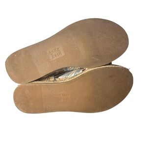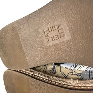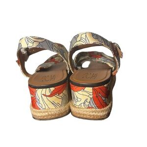 Naturalizer brand platform sandals. Tropical floral print in a faded yellow/cream, rust and light blue. Adjustable strap. Flaw-does have slight staining on floral fabric on both shoes please refer to pictures(Not noticeable when wearing). Has almost no wear on soles!