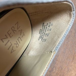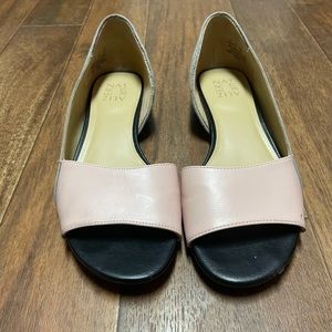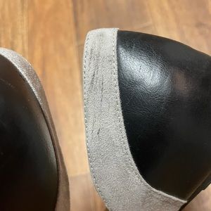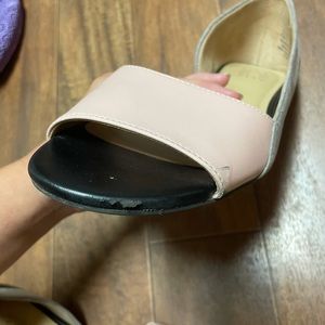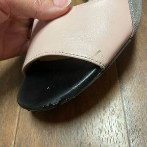 Peep toe colorblock flat faux leather. Pink grey black last 3 photos show the wear they have.