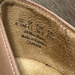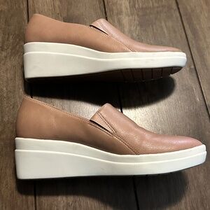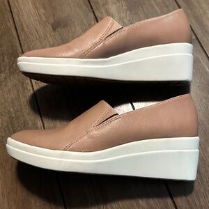 Naturalizer Sandra Slip on gingersnap sneaker. Tan and white, 2 inch heel. Sporty slip on sneaker with all day wedge heel. Hidden elastic stretch on the crease. Fabric and man made upper with an almond shaped toe. Synthetic lining and sole. Excellent condition, like new.