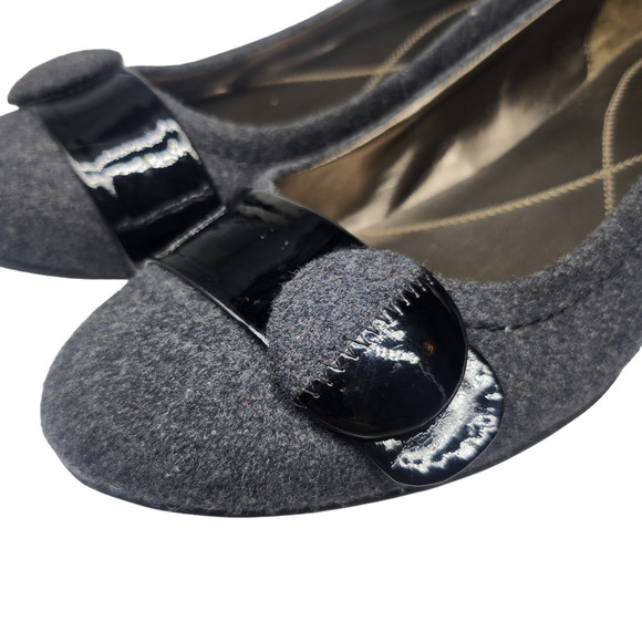 Good condition, low heeled Naturalizer flats in a womens 9.5. Super cute colorblock design. Gray almost looks like a wool, and black is a faux patent leather. Some marks you can only see in certain lighting on the black faux patent leather. Some scratches on insoles but overall fairly clean! Versatile to dress up or down.