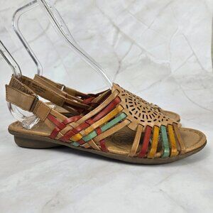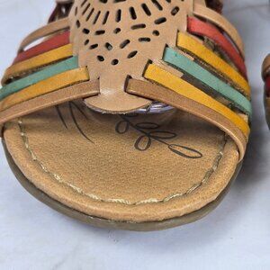Muted colorful huracha sandals have a tan leather upper with rubber soles. The back strap has a hook and loop closure for a customized fit. Comfort insole.
