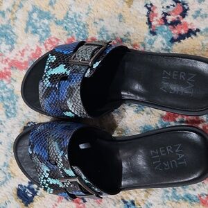 Naturalizer snake print slides. Features a side buckle with green, blue, and black. Super cute addition to any summer outfit ! They are new w/out tags.