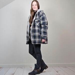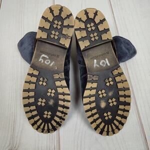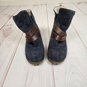 Moto / biker meets Ugg shearling boot in navy blue genuine suede leather with dark brown faux leather decorative double ankle strap and brass buckle. High ankle or low calf length. Cream faux fur / faux wool lining. Rugged lug sole. Zipper closure on the inner ankle. Women's size 8.5 Wide. Flannel hoodie pictured is also for sale - see separate listing.