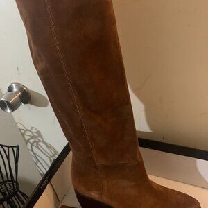 Knee-high tan suede Naturalizer boots, size 10W. These boots were worn but are in great shape, featuring nice suede fabric and stacked heels of 3 1/2 inches.
