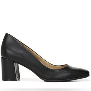 A square toe updates a classic leather pump grounded by a walkable block heel.