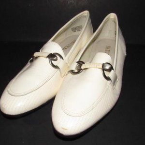 Vintage, Naturalizer, textured white patent leather, size 6, lightly used, loafers! These are the perfect loafers for you with a lot of style! They are a loafer style and have a chrome horse-bit and bamboo accents at the toe. Wear and aging consistent with pre-owned vintage item. Please see photos for more details. Item #: 24003685.