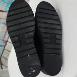 Stylish black suede ankle boots. Features a tan sole. Perfect for any occasion.