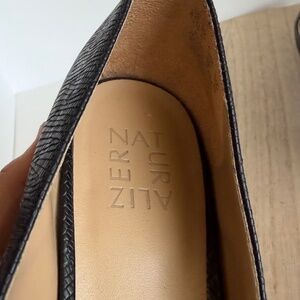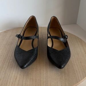 Elegant and timeless Naturalizer Mary Jane heels in black faux-leather with a subtle textured reptile pattern. Designed with the brand’s signature comfort footbed, these shoes balance style and practicality — perfect for work, evening wear, or everyday use. These heels feature a secure buckle strap, low block heel, and classic pointed toe for a flattering, polished look. Clean inside and out with minor signs of wear. Item specifics: Brand: Naturalizer Style: Mary Jane / Heels / Pumps Color: Black Size: 8.5 (Women’s) Material: Man-made upper (textured faux leather with reptile-like pattern) Toe Shape: Pointed Toe Heel Height: Approximately 2 inches (low to mid heel) Closure: Buckle strap Condition: Pre-owned — gently used with light wear on soles and interior (see photos). Uppers are clean and in great shape.