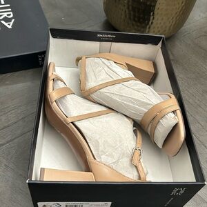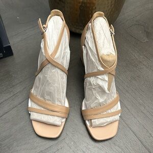 The strappy leather vamp boasts a square toe silhouette, open toe design, buckle ankle strap, and heel cup.