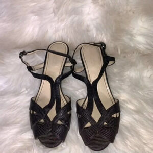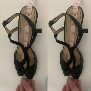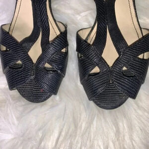 Naturalizer black snake skin textured ankle straps. Peep toe. Cushioned foot bed. Cork wedge. Adjustable ankle strap. Excellent used condition. No noted flaws