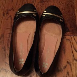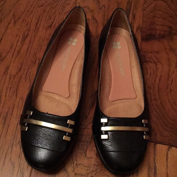 Black Naturalizer flats with small heel with gold/brass hardware. Worn 1x women's' size 4.5