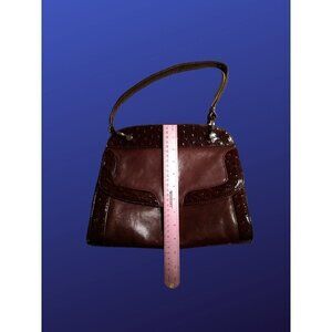 100% Brown Leather top-handled satchel, trimmed in Ostrich-patterned patent leather; several organizational slots in fabric lining for credit cards, ID,