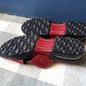 Bright red slip on sandals. Very comfortable Good traction - you won't slip in thr rain..