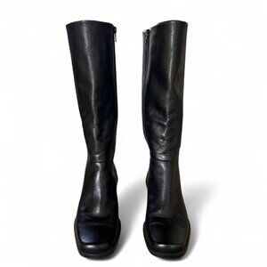 Naturalizer tall black leather riding boots with side zipper and silver buckle. Rounded square toe.