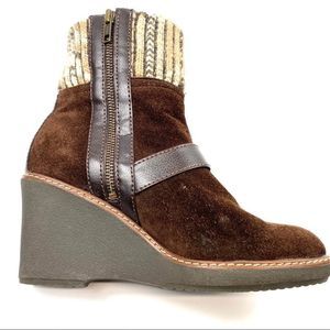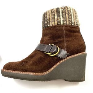 Ankle high brown suede wedge boot with sweater knit and side zip