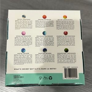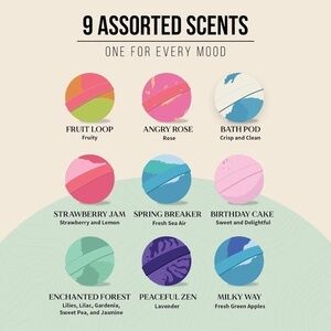9 BLISSFUL SCENTS: Enchanted Forest (Lilies, Lilac, Gardenia, Sweet Pea, and Jasmine), Bath Pod (Crisp, Clean Room), Birthday Cake (Sweet and Delightful), Strawberry Jam (Sweet Aromas of Strawberry and Lemon), Peaceful Zen (Lavender), Milky Way (Fresh Green Apples), Angry Rose (Rose), Spring Breaker (Fresh Ocean Air), Fruit Loop (Fruity)