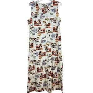 Naturals D&Co sleeveless maxi dress, women’s size Large. Linen/cotton blend fabric in a cream background with villa/tropical house scenic print in warm earthy tones. Long, straight silhouette with a relaxed fit and natural texture. Perfect vacation-ready summer dress that can also be styled casually for everyday wear.