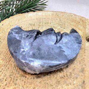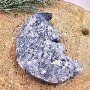 This moon decor has an unique design. It is hand carved with nature stone crystal cluster with dark grey color. You will see two completely different appearance. One side is shinny and smooth texture and the other side is very rustic uneven covered with crystal points.