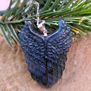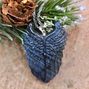 Nature Labradorite Carved Flashy Angel Wing Pendant Necklace. Price includes both pendant and chain.