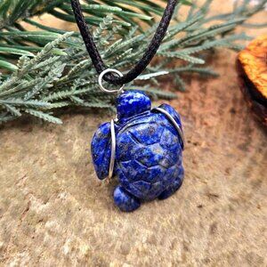 Nature Lapis Lazuli Carved Cute Turtle Wire Wrapped Pendant Necklace.