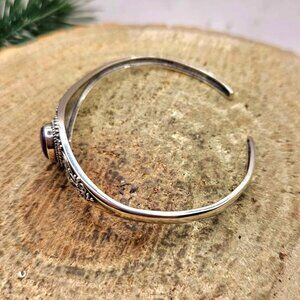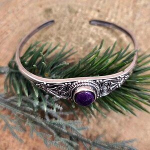 This entire cuff bangle is made with sterling silver with S925 stamp. You will see a beautiful genuine purple sugilite at the center. There are beautiful pattern at front with two artisan heart, dotted and frame around the stone.
