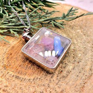 This colorful square shape pendant is filled with mixed crystal chips. Including nature super seven, blue kyanite and ruby. You will see beautiful mixture of purple, red, blue. It is a floating design, therefore these crystal will shake around when wearing.
