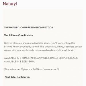 The core bralette from Naturyl by Niykee Heaton / NBK. Smoothing lifting seamless design. Super comfortable fit, almost makes it feel like it’s made specifically for you! Great for lounging or working out in. Smooth fabric and criss cross bands. Brand New with Tags, Never worn! Color is NAVY, other photos are to show how it fits.