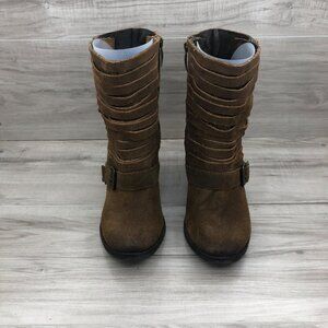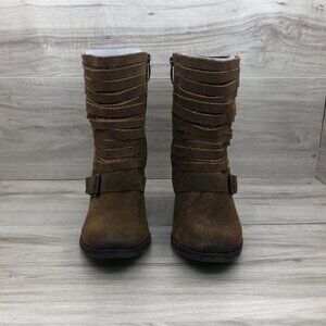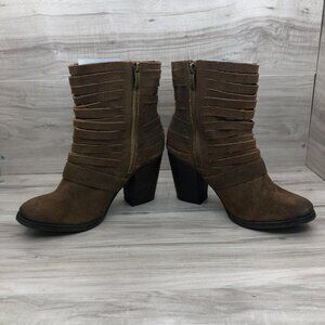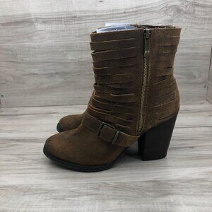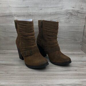 Stylish brown ankle boots with side zipper. Features a decorative buckle. Perfect for casual wear.