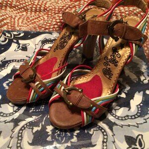 Naughty Monkey 4" Heel Multi Colored Strappy Buckle Sandals Women Size 6.5 Color good condition very unique shoe