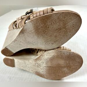 Gently worn Naughty Monkey Dually Noted cream leather wedge sandals. Lightly padded for comfort and side buckle closure.