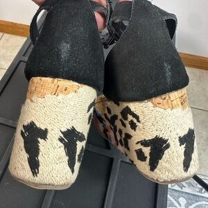 Elevate your style with these Naughty Monkey black platform sandals, featuring a cork base and artistic embroidered patches. The black straps and silver buckle closures make for an adjustable fit. Perfect for a casual summer outing.