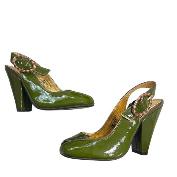 Naughty Monkey green patent leather heels with side buckle, peep toe, sling back, block heels