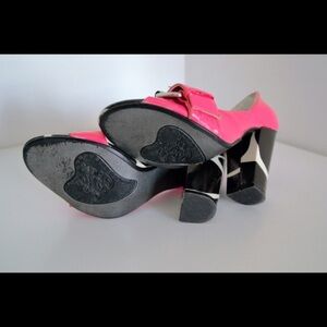 Naughty Monkey open toe pumps. Leather upper. Coral pink, silver tone buckle and zebra print chunky heels (black & white). .