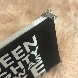 Cosmetic bag that says the same thing on both sides as shown in the photos. Has a zipper to close it.