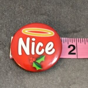 Naughty and Nice Buttons Set of 2 Christmas Holiday Pin backs Mistletoe Halo. In very good used condition. There is no visible damage. Please see pictures for item description.