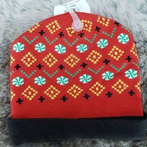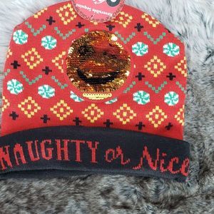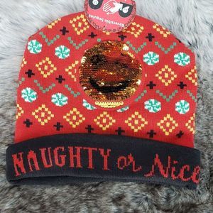 Naughty Or Nice Christmas Beanie Winter Hat Holiday Changeable Smiley Face Red