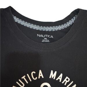 This Nautica tee showcases a bold white anchor logo on a sleek black fabric, creating a timeless and stylish look. With its classic crew neckline and short sleeves, it offers both comfort and versatility for everyday wear.