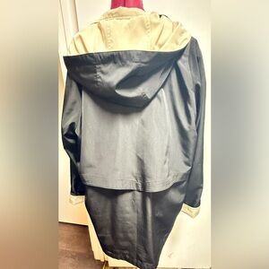 Elegant trench coat with a sleek design. Features a classic black exterior and cream interior. Ideal for versatile styling.